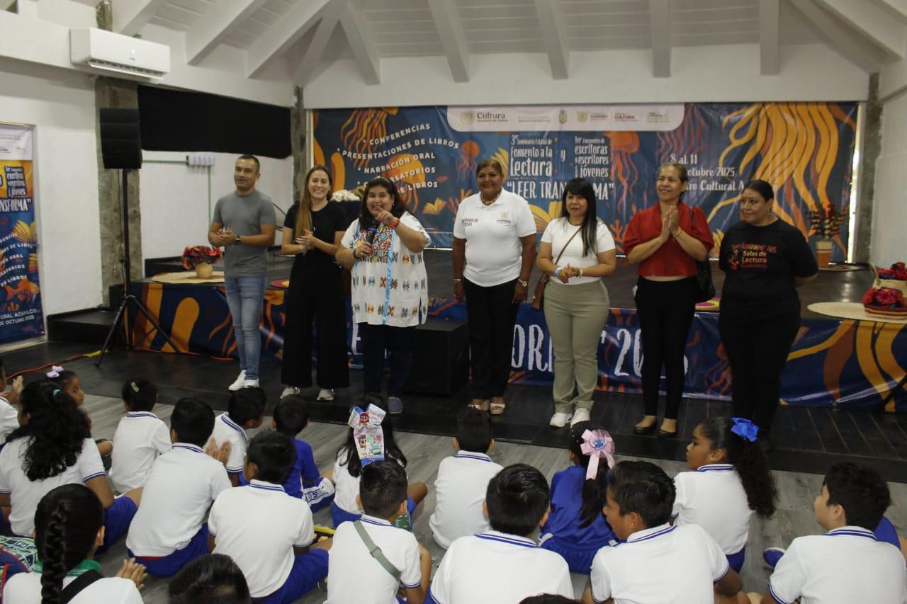 Con una emotiva y divertida jornada, dieron inicio las actividades del 3er. Seminario Estatal de Fomento a la Lectura y el 1er. Encuentro de Escritoras y Escritores con Jóvenes “Leer Transforma” 2025, en el Centro Cultural Acapulco. El evento es impulsado por el Gobierno del Estado de Guerrero, que encabeza la gobernadora Evelyn Salgado Pineda, a través de la Secretaría de Cultura, dirigida por Aída Melina Martínez Rebolledo. Desde temprana hora, niñas y niños de las escuelas primarias “Club de Leones”, “María Orozco de Marrón” y “Teniente José Azueta” disfrutaron de la narración oral “¿Esto sucedió en México?” a cargo de Apolonio Mondragón, reconocido narrador del Programa Federal Alas y Raíces. Con su estilo carismático, Mondragón llevó a los pequeños a un viaje lleno de historia, humor e imaginación. En el acto de apertura estuvieron presentes la secretaria de Cultura, Aída Melina Martínez Rebolledo; la encargada del Centro Cultural Acapulco, Nelly Solís Ramírez; la directora de Administración y Finanzas, Celia Ramírez Martínez; la asesora de Proyectos, Alma Delia Barrios Carreón; y la jefa del Departamento de Formación Lectora, Tonantzin Arcadia Romero Hernández, quienes dieron la bienvenida a los asistentes. Este evento forma parte de las acciones que impulsa el gobierno estatal para promover el hábito de la lectura, el encuentro con autores y la formación de nuevos públicos culturales en Guerrero.