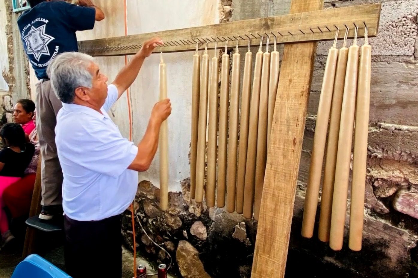 Con paciencia y devoción, habitantes de todas las edades modelan las velas que alumbrarán las fiestas patronales, en un ambiente festivo acompañado de música de viento y estallidos de cohetes que anuncian que el pueblo está de fiesta.
